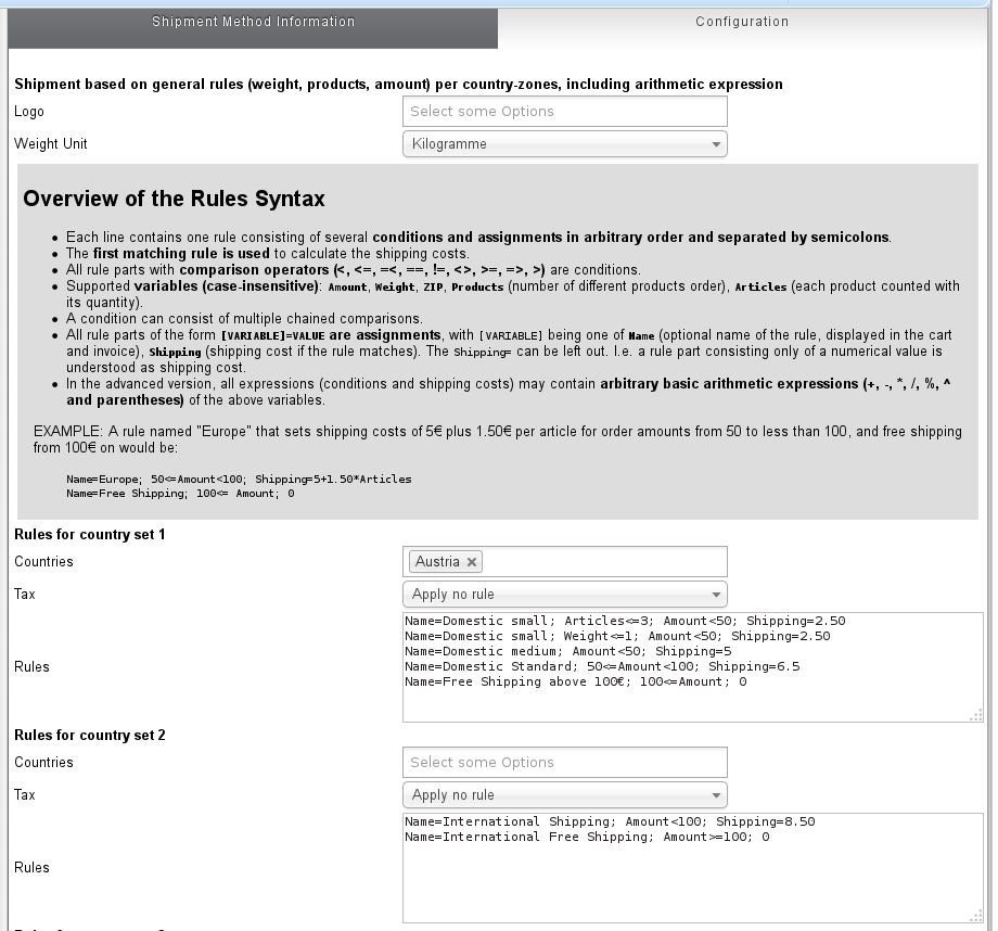 Name=Domestic small; Articles<=3 OR Weight<=1; Amount<50; Shipping=2.50 Name=Domestic medium; Amount<50; Shipping=5 Name=Domestic Standard; 50<=Amount<100; Shipping=6.5 Name=Free Shipping above 100€; 100<=Amount; 0