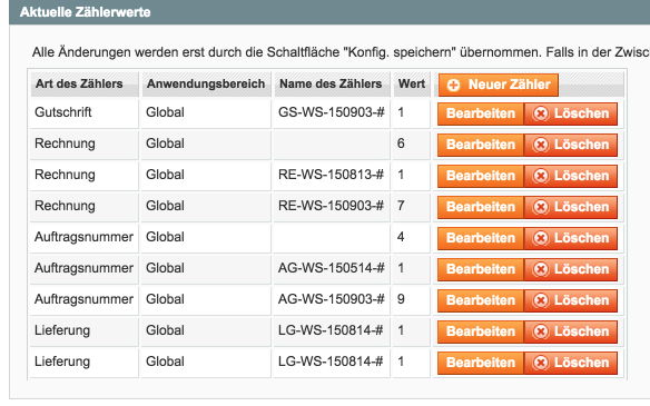 What are your exact settings for the extension? To me it seems like several of the counters were created automatically during a testing phase. To me it appears that you changed the counter setting from "format-specific counter" to "global counter" on Sept 3 or 4. The current counter values are in line with such a config change. Regarding the counter names: - Global counters have no name (they are global, so there is no need to distinguish them). - Format-specific counters have the name of format with all variables replaced by their values. For more insight on the counter naming, the following section (for the ordernumber plugin for VirtueMart, but that plugin uses the exact same logic as the Magento extension) might give you some more information: open-tools.net/documentation/ordernumber...at_specific_counters Regarding your questions: 1) The counters named "RE-WS-150813-#" and "RE-WS-150903-#" seem to come from your tests, before you changed the counter to global. A format-specific counter on Aug. 13 uses "RE-WS-150813-#" as its counter name, and on Sept. 3 it uses "RE-WS-150903-#" as counter name. Clearly, once that day has passed, the counter will never be increased any more. After you switched to a global counter, the counter that is now actually used is the unnamed counter in the second row (with value 6). 2) If you look at your invoice numbers, starting on Sept 5, the numbers are increasing as expected. So I would guess that there was some config change (from format-specific counter to global counter) between the test orders on Sept 3 and the test orders on Sept 5... Without knowing the exact configuration, it's hard to give secure advice, which counters are not needed any more and can deleted... About half of the existing counters can be deleted, but without further information I hesitate to give instructions which of the counters are no longer required. Judging from the test orders on Sept 5 and 7, I would say that the counter properly increases with the current settings, but those old orders are not increasing as expected due to config changes. Best regards, Reinhold |