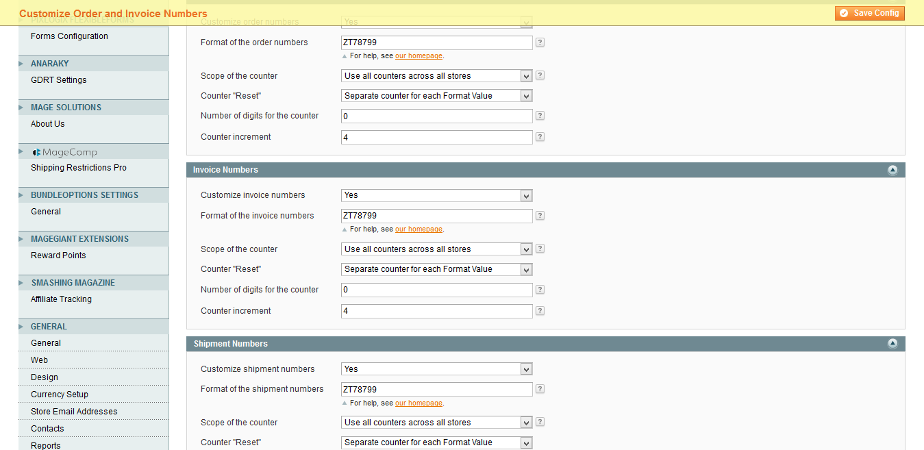 I have added the plugins in my magento 1.9.1.1 based store.In the settings I have set format for the order no and invoice no ZT78787 and counter increment is 7.After Placing an order orders are showing ZZ00078795,ZZ00078796,ZZ00078795 in this way.It is not incremented by 7 that I set in configurations. Also Shipment id has totally changed and it is showing this series now ZZ00078788, ZZ00078789 Am I doing anything wrong in settings? Can you please check the settings what is happening? Thanks, |
