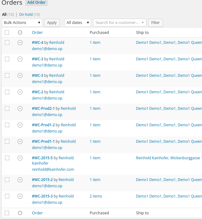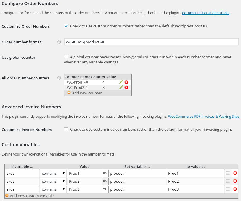 1 (Product 3 ordered) #|WC-[product]-# The orders will again be named WC-Prod1-#, WC-Prod2-# (see the counter table in the middle of the page). The difference is that now these counter names are only used to determine the next counter value, but the actual formatting will use the part before the |, i.e. it will be jsut the number. As proof that this works, I'm also attaching a screenshot of the order list, where I set up three products with SKUs "Prod1", "Prod2" and "Prod3". First I set the order number format to (the first use case described above): "WC-[product]-#" Second, I set the order number format to (the second use case described above, except that I prepended WC- to the display string, so the resulting order numbers are WC-1, WC-2, WC-1, WC-3, WC-1, etc.): "WC-#|WC-[product]-#" I hope this solves your problem and creates order numbers as you like them. If you have any further issues, feel free to contact us again. Best regards, Reinhold PS: Rather than creating the custom variable "product", you can even set the variable ordernumber_format to a format string of your choice. This will override the order number format string from the plugin configuration when the condition is met. This means that for Product 1, you can have an order number format "Prod1-[year]-#", while for Product 2 you can set the order number format to "[year]/[month]/[day]-[hour]/#", etc. |