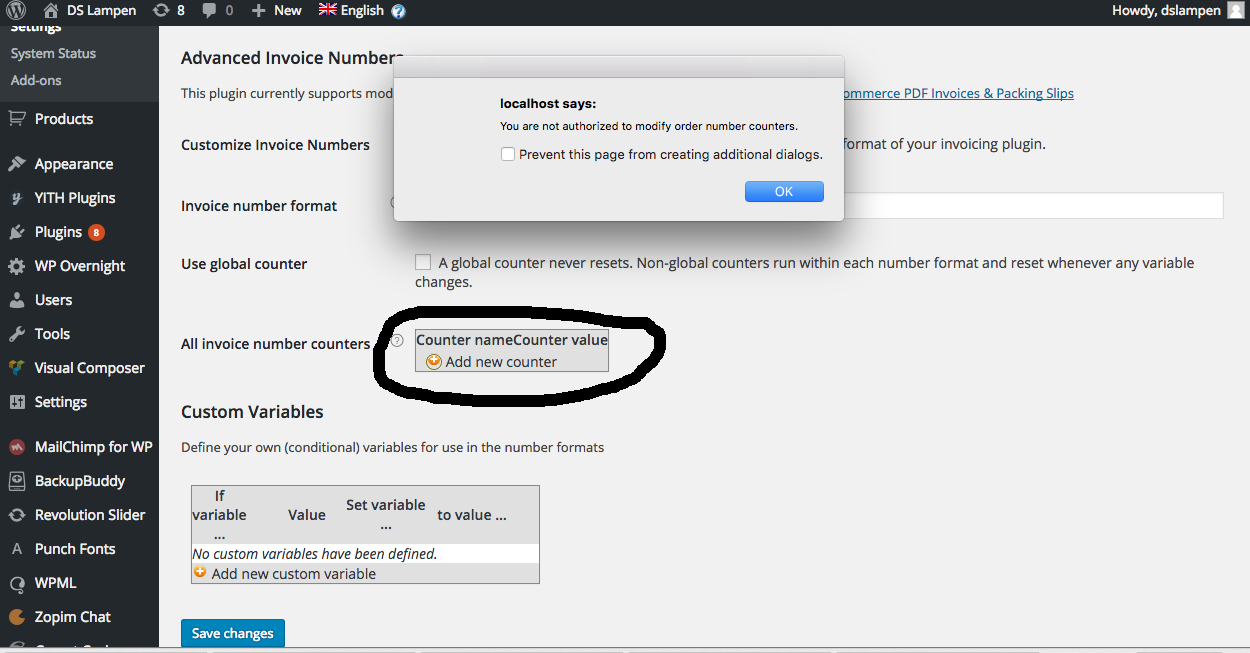 I went ahead and manually changed the invoice number of the first real order to 00001 in phpmyadmin (wp_options). However, I did a test order and the next invoice was generated as 00006. I also tried to add a new counter in the "All invoice number counters" section using the name #####, but after clicking save changes it dissappeared. I tried to add it in again but it gave me an error message about not being authorized to do so (see screenshot).
