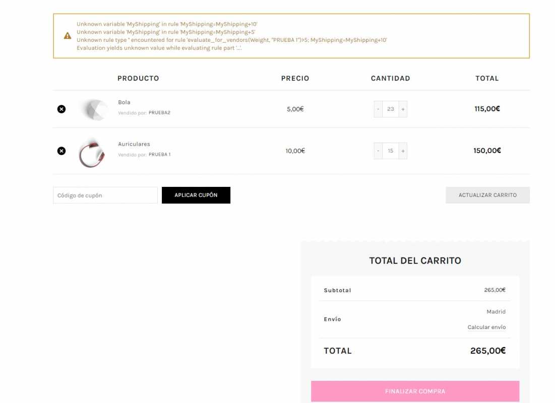 The rules I have used are these: Definition=myship; Value=0 Definition=myship; evaluate_for_vendors(Weight, "PRUEBA2")>5; Value=myship+10 Definition=myship; evaluate_for_vendors(Weight, "PRUEBA2")<5; Value=myship+5 Definition=myship; evaluate_for_vendors(Weight, "PRUEBA 1")>5; Value=myship+10 Definition=myship; evaluate_for_vendors(Weight, "PRUEBA 1")<5; Value=myship+5 Name="Gastos diferentes marcas"; Shipping=myship Thanks |