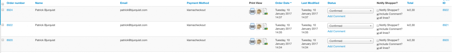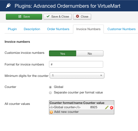 Before my order number and invoice number was the same and my Order ID as well (kept them synced by not deleting orders). But now after an order is created and I create an Delivery note or an Invoice - that Delivery note or Invoice gets the next 'order number'. ---- Order number: 8900 Invoice number: 8901 ---- Order number: 8902 Invoice number: 8903 ---- etc Plugin is set to GLOBAL on Orders and Invoices with same number on both 8901/8901 with simple format # and deactivated on Customer I'm using; - Klarna Checkout plugin for payments (developers.klarna.com/en/se/kco-v2/klarna-checkout-overview-v1) - Advanced Ordernumbers for Virtuemart (open-tools.net/documentation/ordernumber...-for-virtuemart.html) I've been up and down Google and Forums but haven't found any help so far. I'm a bit novice to this so apologize in advance if this is a really noob question. Thank you in advance for your help! //Patrick System Information Setting Value VirtueMart 3.0.18 PHP Built On Linux vps1.ovv.no 2.6.32-573.18.1.el6.x86_64 #1 SMP Tue Feb 9 22:46:17 UTC 2016 x86_64 Database Version 5.5.43-MariaDB Database Collation latin1_swedish_ci Database Connection Collation utf8mb4_general_ci PHP Version 5.6.29 Web Server Apache/2.2.22 (@RELEASE@) WebServer to PHP Interface apache2handler Joomla! Version Joomla! 3.6.0 Stable [ Noether ] 12-July-2016 21:14 GMT Joomla! Platform Version Joomla Platform 13.1.0 Stable [ Curiosity ] 24-Apr-2013 00:00 GMT User Agent Mozilla/5.0 (Macintosh; Intel Mac OS X 10_10_5) AppleWebKit/537.36 (KHTML, like Gecko) Chrome/55.0.2883.95 Safari/537.36 |