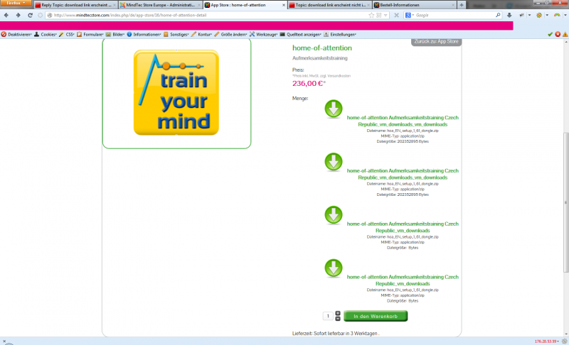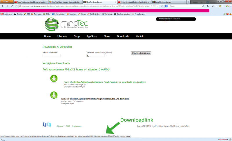 Was ist die genaue Fehlermeldung bei den Links in der Produktansicht?