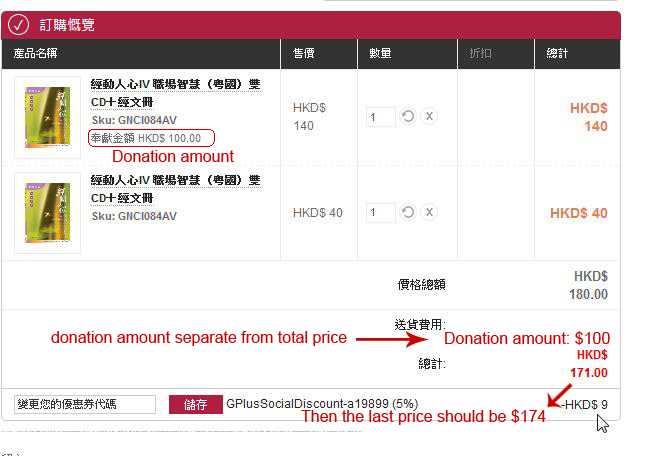 Is it possible do the donation amount separate from total price when check out? It is because the donation amount would be deductions in the total price by another discount plugin. Thanks. |