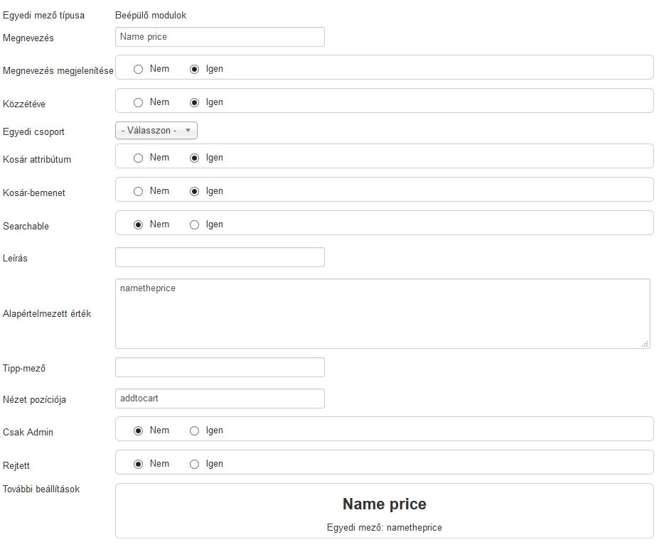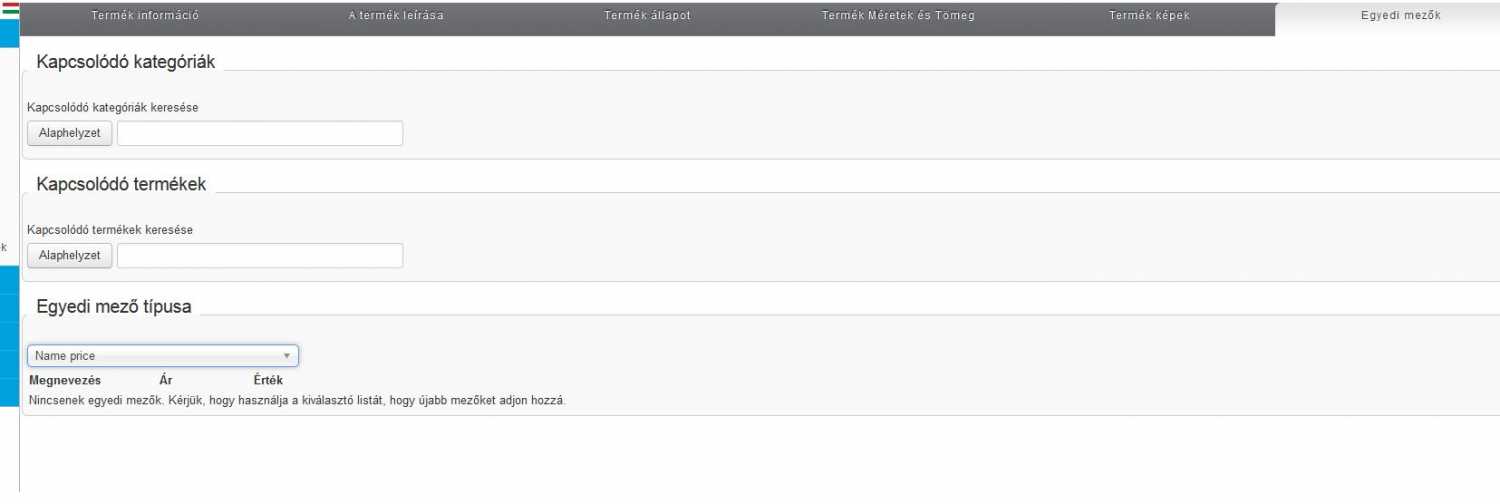 When you select "Name price" from the dropdown box in the "Egyedi mezö tipusa" area of the product's Egyedi mezök tab (note: you explicitly have to click on the dropdown box and click on "Name price" to add the custom field, even though "Name price" is already shown... The reason is that VM handles a selection from the dropdown box also like a button click, so you have to click somewhere.)? In particular, do you see any warnings/error messages in your PHP log on your webserver? Best regards, Reinhold |