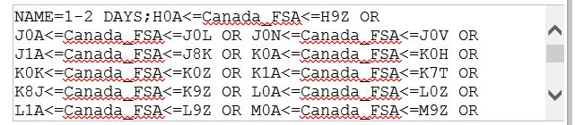 NAME=1-2 Days; H0A<=Canada_FSA=>H9Z 0R J0A<=Canada_FSA=>J0L 0R J0N<=Canada_FSA=>J0V 0R J1A<=Canada_FSA=>J8K 0R K0A<=Canada_FSA=>K0H 0R K0K<=Canada_FSA=>K0Z 0R K1A<=Canada_FSA=>K7T 0R K8J<=Canada_FSA=>K9Z 0R L0A<=Canada_FSA=>L0Z 0R L1A<=Canada_FSA=>L9Z 0R M0A<=Canada_FSA=>M9Z 0R N1A<=Canada_FSA=>N9Z; WEIGHT<=20; SHIPPING=20