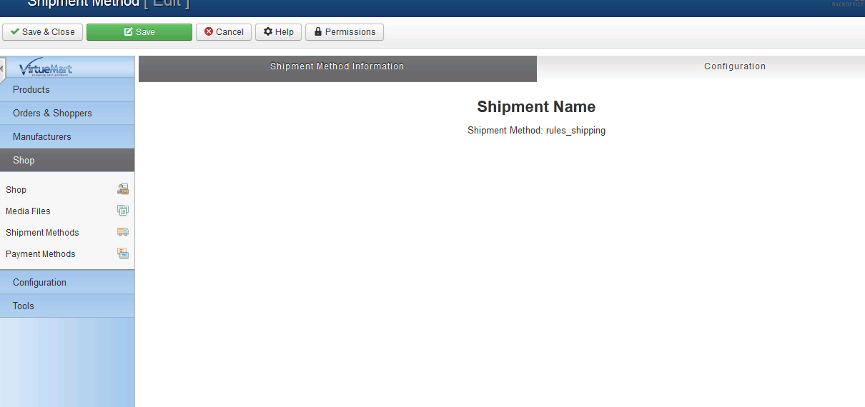 I use 3.3.1 J and VM2. ( the plugin in "Joomla plungin" is ON) Im install the plugin, bun in » configuration » shipment method, dont apear any configuration. the only thing that appears is: Shipment Name Shipment Method: rules_shipping Edit: Someone to help me please? I searched here in the forum, something equal, but not found nothing |