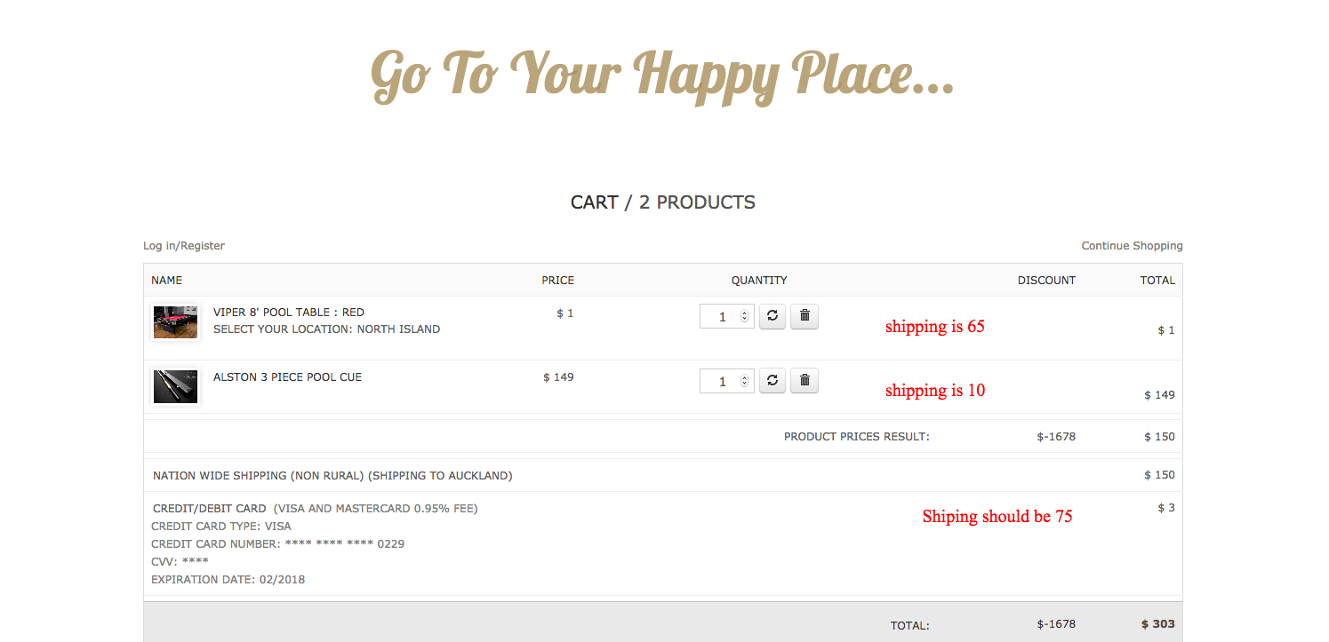 When I do this with the pool table the shipping is 65 which is correct, but when I add a pool cue"Courier" item the shipping goes to 150. See attached. If the pool cue is by itself the shipping is $10. Its only when they are combined.