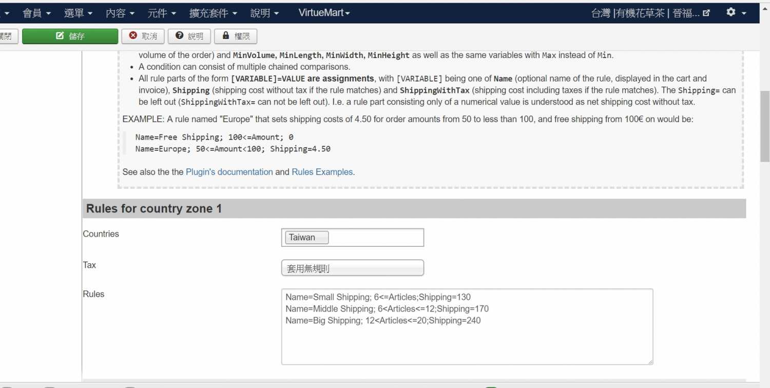 My rule is Name=Small Shipping; 6<=Articles;Shipping=130 Name=Middle Shipping; 6<Articles<=12;Shipping=170 Name=Big Shipping; 12<Articles<=20;Shipping=240 Are these errors? If there is an error ,please tell me Or need to do other settings? Because it cannot be displayed. Thanks! |