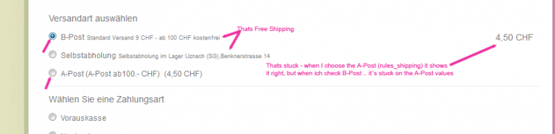 Installed the plg_vmshipment_rules_shipping_v2.4.1 on the production server, pulished and configured it with .. Name=A-Post bis 100.- CHF; Amount<100;Shipping=13.5 Name=A-Post ab100.- CHF; 100<= Amount; 4.50 ... and have 2 additional standard vm shipping options in there (weight_countries) On the production site, it works as it´s supposed to be ... changing shipping shows the right prices depending on the configuration. I did mirror the production site to the live site, and there it´s buggy - when I switch between the shippments, the price is stuck to the configuration of the "rules_shipping" ... shipping prices don´t change when I click to "weight_countries" ? I do have VM 2.0.20b and onepagecheckout plugin. I did uninstall the plugin, re-installed it and used the database tools ... see screen for the buggy behaviour ... anybody any ideas ? |
