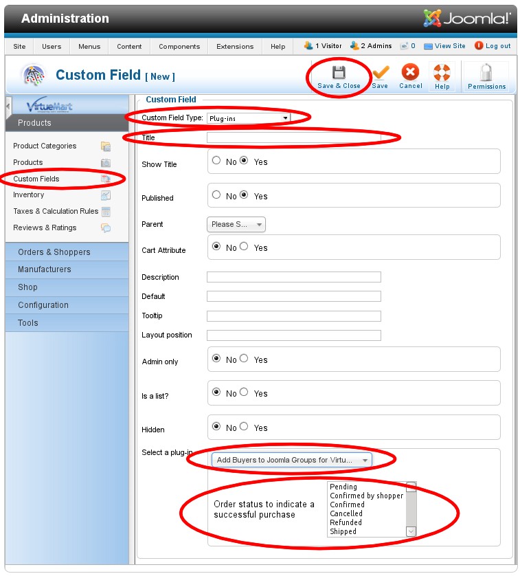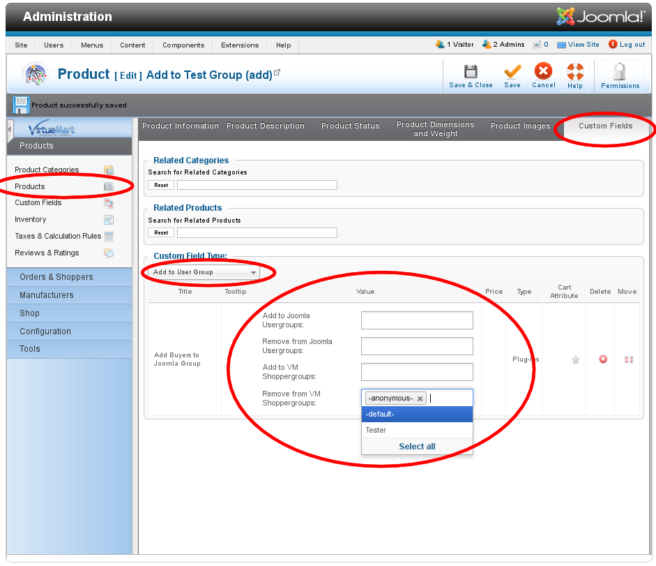 - Open the product in the VirtueMart backend, go to the "Custom Fields" tab and add the field you just created (the Title you selected in the custom field setup above). You can now select the Joomla and Virtuemart groups for the product, where buyers should be automatically added to or removed from upon purchase.