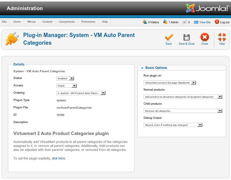 After installation, you need to enable and configure the plugin. By default, the plugin does not modify any categories automatically! You have to manually configure the plugin in the Joomla plugin manager (NOT inside VirtueMart!) first: