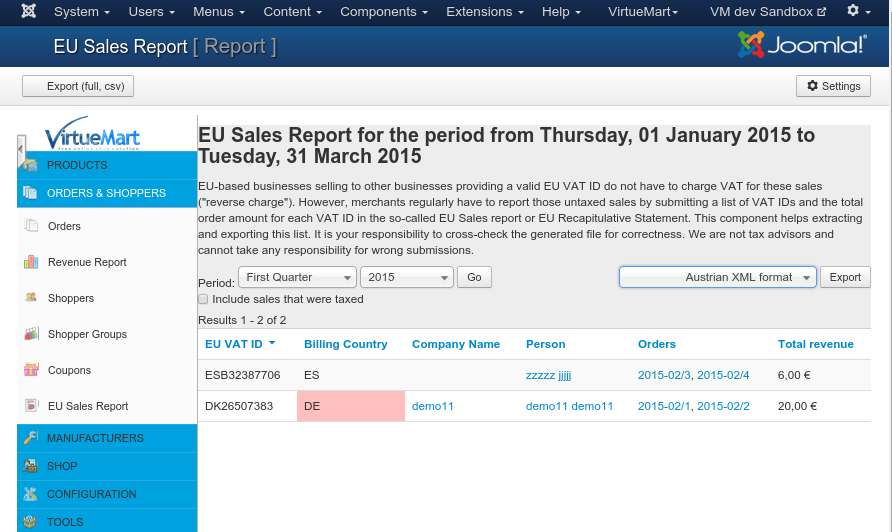 This component helps extracting and exporting this list. After installation, it is available in the VirtueMart Backend under the menu "Orders & Shoppers" => "EU Sales Report".