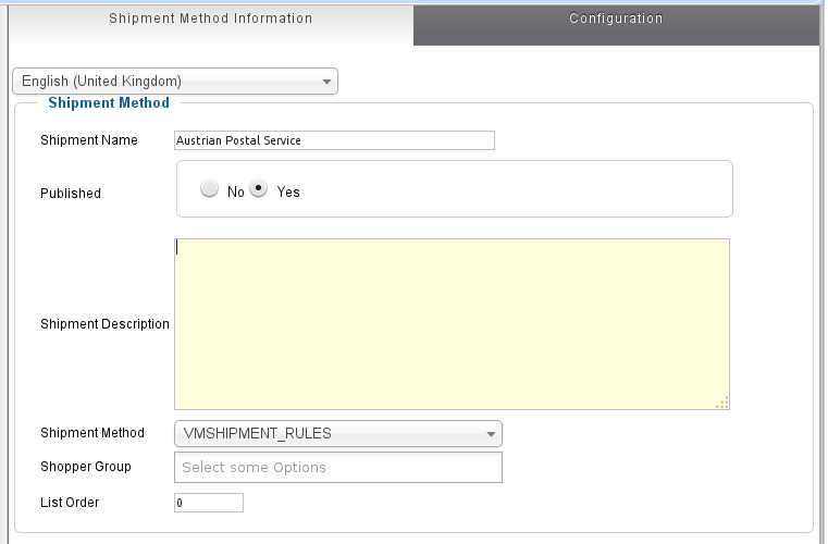 - Go to "Shop" -> "Shipment Methods" and click on "New"